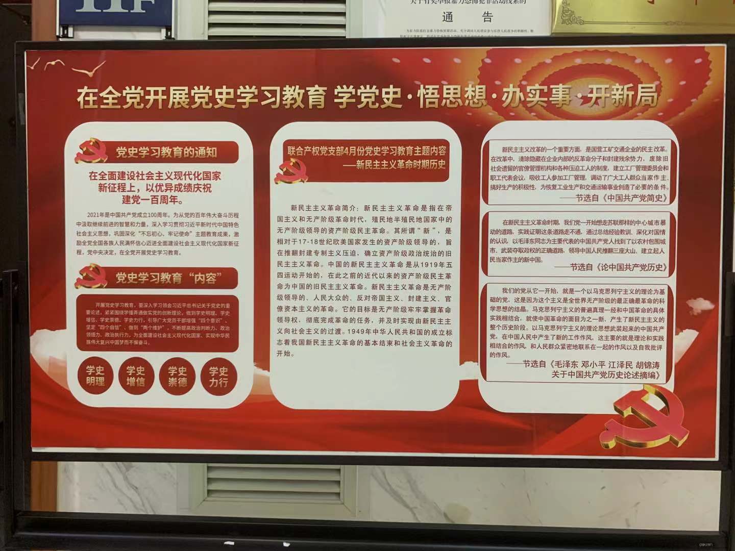 自黨史學(xué)習(xí)教育開展以來,聯(lián)合產(chǎn)權(quán)黨支部通過制定學(xué)習(xí)計(jì)劃、制作月度學(xué)習(xí)宣傳欄、組織黨員定期學(xué)習(xí)討論等方式持續(xù)推進(jìn)學(xué)習(xí)教育工作。下一步,聯(lián)合產(chǎn)權(quán)黨支部將繼續(xù)深入開展黨史學(xué)習(xí)教育主題活動(dòng),切實(shí)把黨史學(xué)習(xí)教育與總結(jié)經(jīng)驗(yàn)、觀照現(xiàn)實(shí)、推動(dòng)工作結(jié)合起來,切實(shí)做到學(xué)黨史、悟思想、辦實(shí)事、開新局,鍛造“不折不扣、不偏不倚”的政治執(zhí)行力,以優(yōu)異成績迎接建黨一百周年。