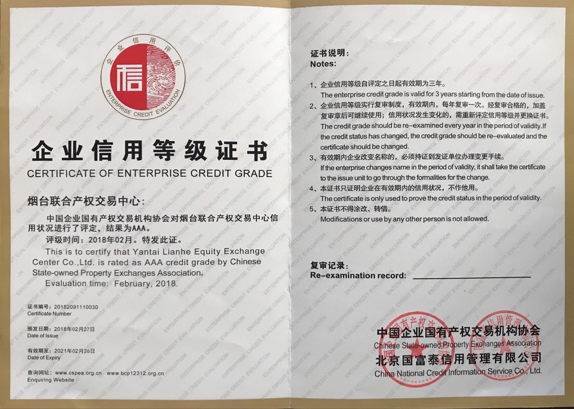 近日,在中國(guó)產(chǎn)權(quán)交易協(xié)會(huì)組織開展的全國(guó)產(chǎn)權(quán)交易行業(yè)信用等級(jí)評(píng)價(jià)活動(dòng)中,煙臺(tái)聯(lián)合產(chǎn)權(quán)交易中心(以下簡(jiǎn)稱“聯(lián)合產(chǎn)權(quán)”)榮獲信用最高等級(jí)AAA級(jí)信用企業(yè)稱號(hào)。