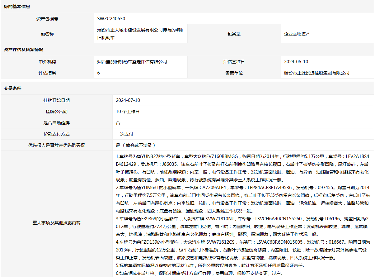 煙臺(tái)市正大城市建設(shè)發(fā)展有限公司持有的4輛舊機(jī)動(dòng)車