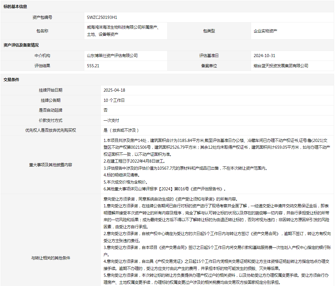 威海鴻灃海洋生物科技有限公司所屬房產(chǎn)、土地、設備等資產(chǎn)