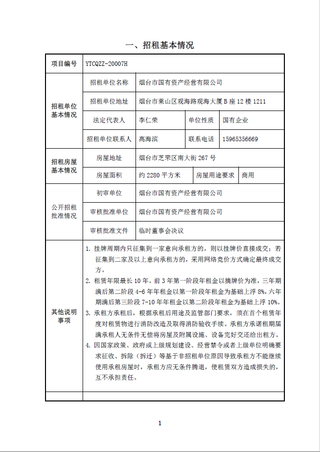 煙臺市南大街267號1-7層(除一樓東側門頭房)、東側停車場招租公告